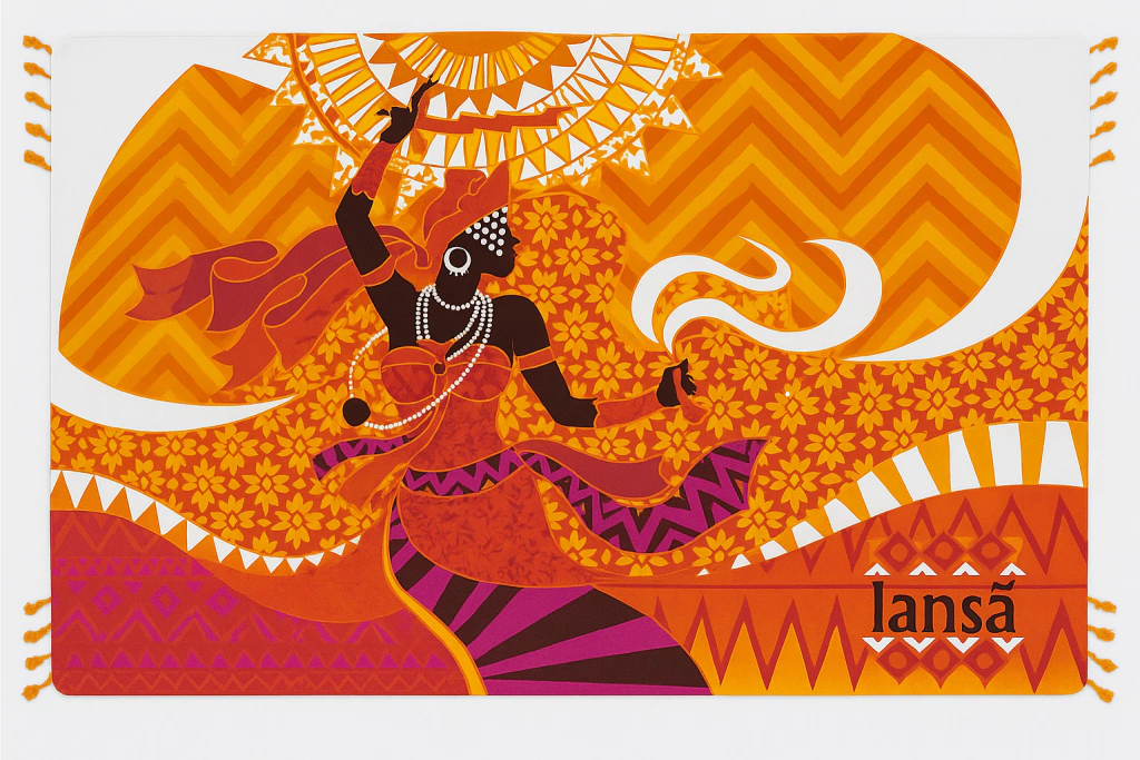 Estampa: Iansã, com tons quentes que remetem ao fogo, à energia e à liberdade